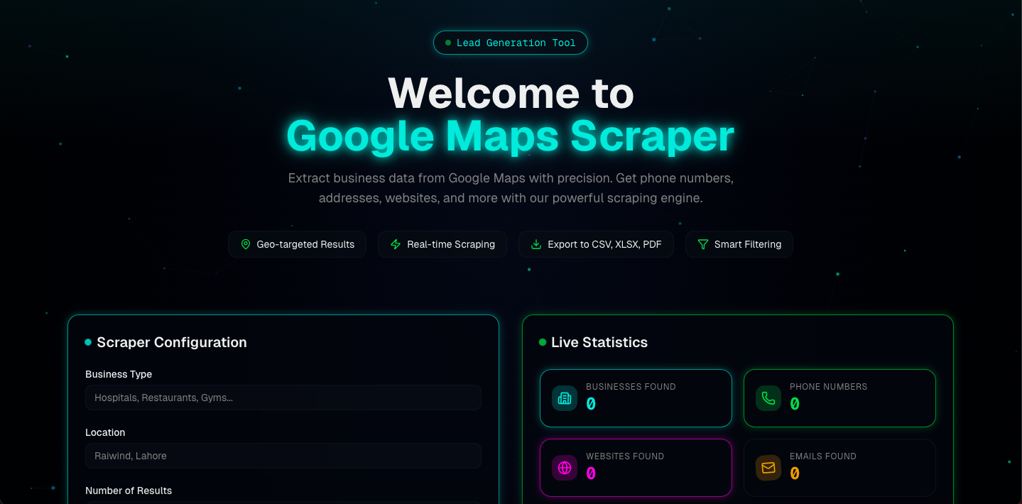 This tool is a powerful Node.js & Puppeteer-based scraper that automates the extraction of business data from Google Maps. It allows users to provide keywords, locations, or geolocation coordinates and retrieves structured business information including names, addresses, phone numbers, websites, and distances within a specified radius.